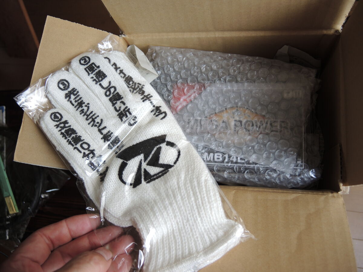 バッテリーと一緒に軍手とグリスも同梱されていました。軍手にはバッテリーの取扱の心得が書かれています。面白い。