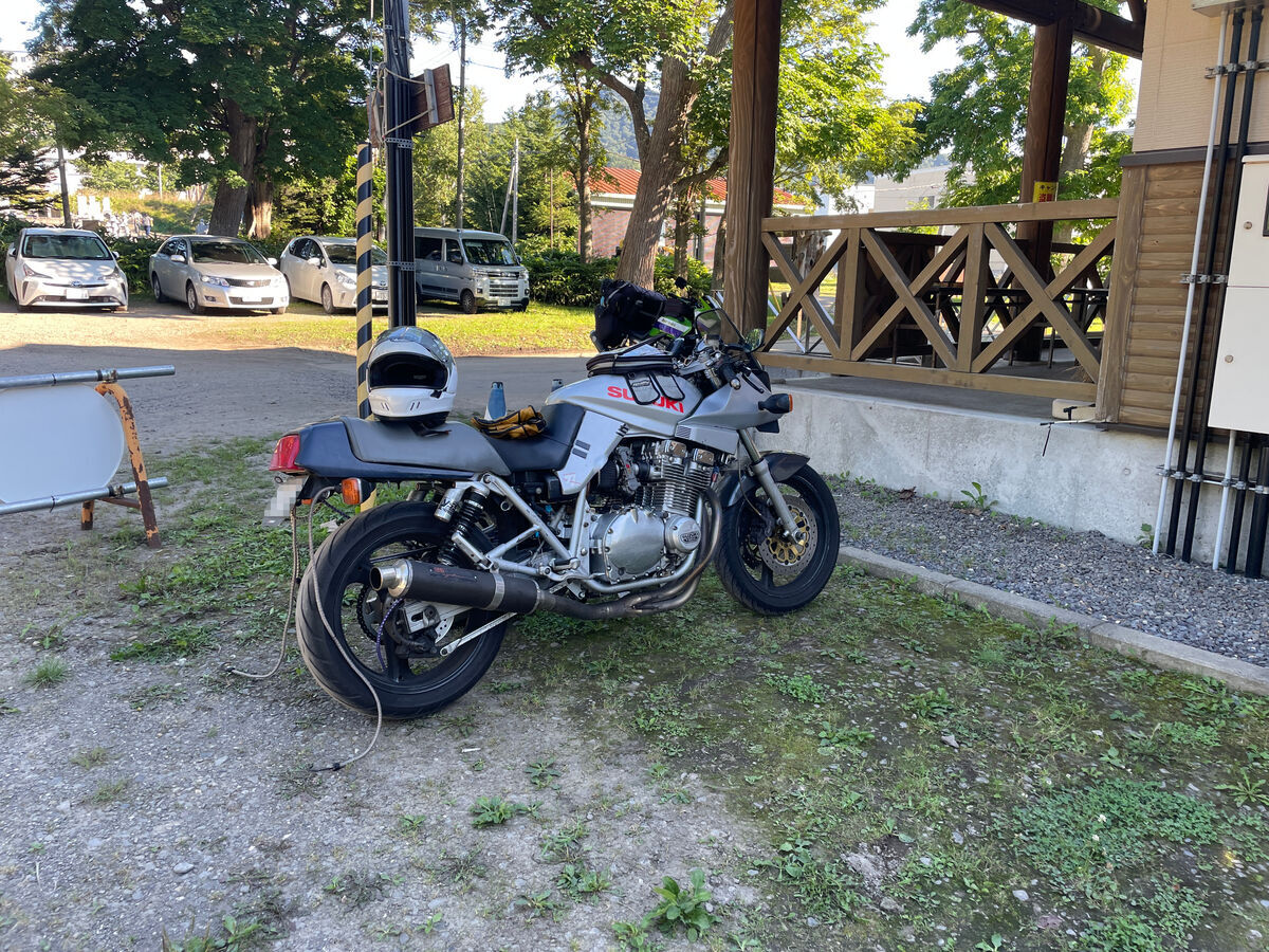 持ち主は初老のライダーで何やら電話中(帰りのフェリーが予定通り出航するのか確認して板らしい)で、電話が終わると何となく話が始まった。私が“おおっRZだ”と思うのと同様に向こうも“おっカタナかぁ”となるわけで。「これ(カタナ)はRZの次に好きなバイクだ」と言ってくれる。