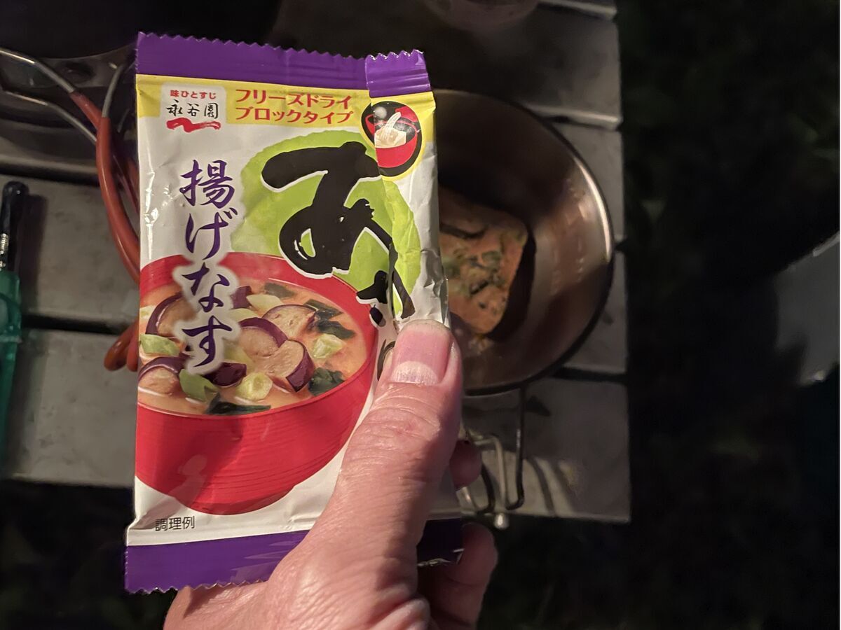陽が沈むまでまだ10分くらいかかるというのでお先に失礼し、セイコマで食料の買い出しをする。今夜は何を食べようか?店内の食材を見て回って肉野菜炒めにする。野菜パックと豚バラ肉の小パック、味噌汁は迷った結果ナスの味噌汁。明日の朝食は気分を変えてセイコマPBカップラーメンとおにぎりにする。セイコマはPB商品が充実していて安い上にどれも美味しそうなのです。