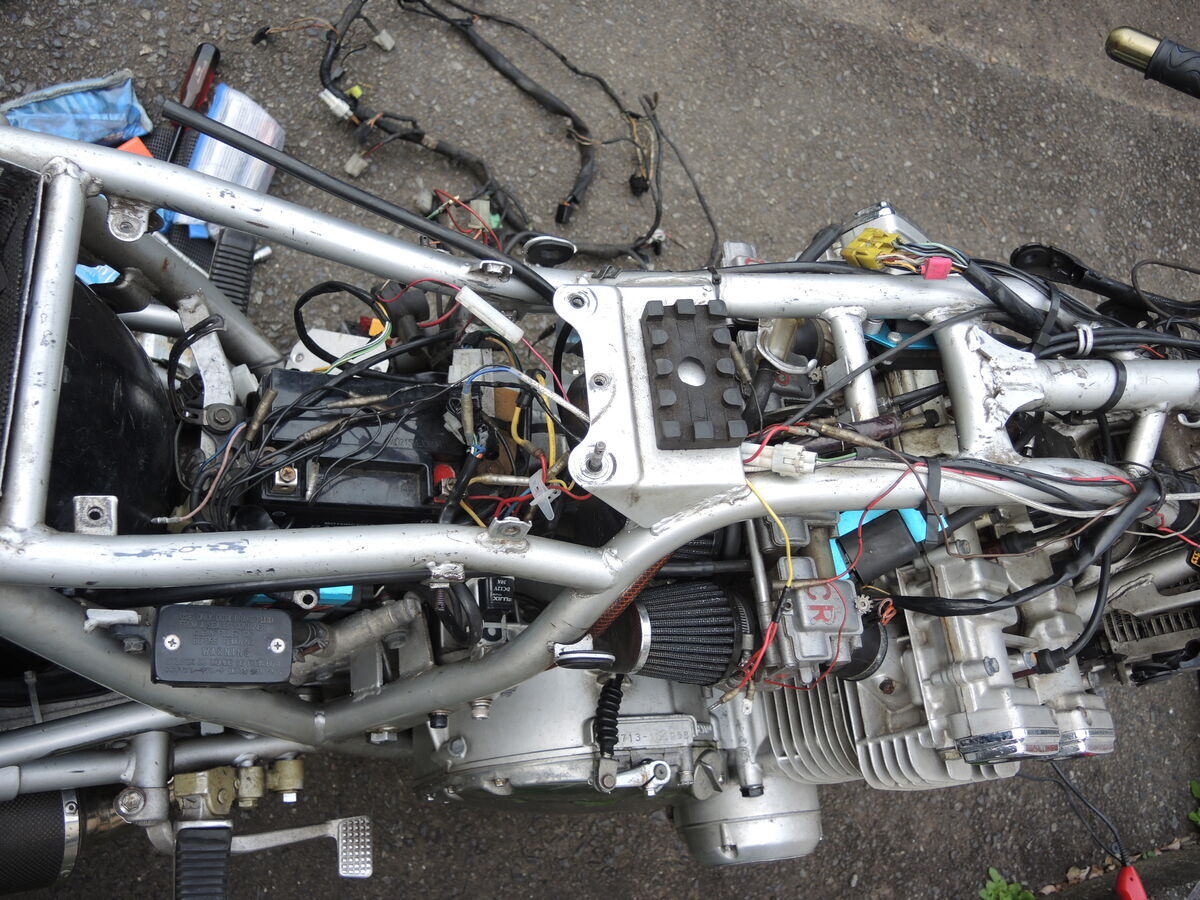 ハーネスやその他の電装品が外されたカタナはただのガラクタに見えます。まあカウルやガソリンタンク等の外装ほ塗装はだいぶ傷んでいてポンコツ感はあったのですが、やはり勣かない状態だと屍のように見えます。